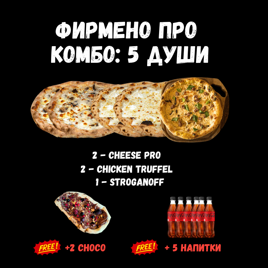 Комбото съдържа: 2 x Chicken Truffel, 2 x Cheese Pro, 1 x Stroganoff, 2 Шоко Пици, 5 Напитки.